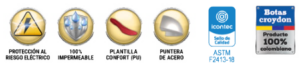 PUNTERA: Fabricada en acero, bota certificada, cumple con la resistencia al impacto de 101.7 J. y resiste una fuerza de compresión de 11.121 N. o 2.500lbf según la norma ASTM F2413-18.