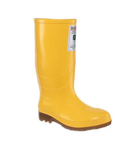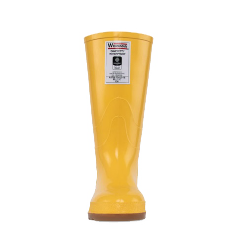 Las botas de construcción Workman Safety WaterProof amarillas son un tipo de bota hecha en PVC y certificada por Icontec con sello de producto de calidad bajo los requerimientos de la norma ASTM F2413-18. Estas botas para la construcción cuentan con puntera en acero, que cumple con la resistencia del impacto de 101,7 J. resiste fuerza de compresión de 11.121N o 2.500lbf de acuerdo a la norma ASTM F2413-18.. Tienen un forro interno 100 % en poliéster tejido rizo, un puente estabilizador para el pie que brinda confort al caminar y una plantilla confort fabricada en poliuretano (PU). Es de color amarilla con suela crepé.